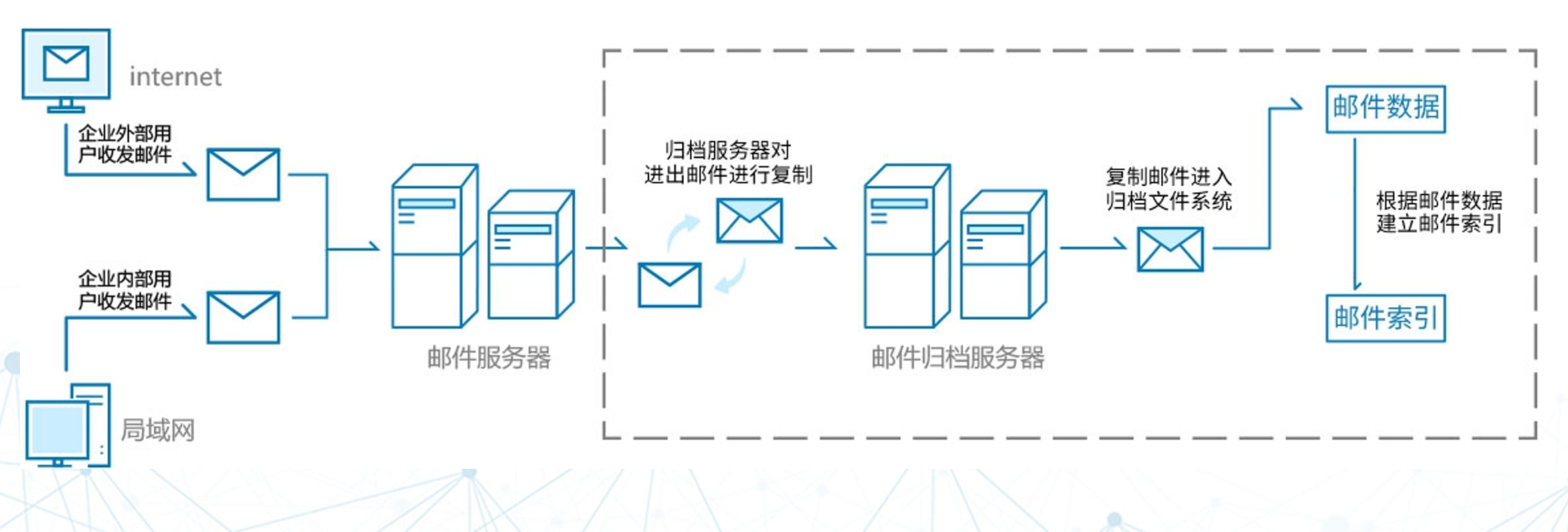 Coremail邮件归档系统采用邮件直接复制的架构,不需要更改现有网络及邮件流架构,可迅速完成系统导入,与现有邮件相关设备及后端存储设备整合兼容性良好,适合各种企业使用。
