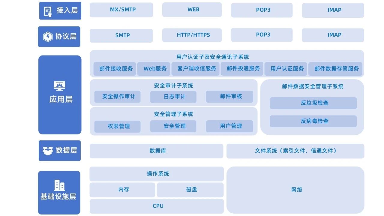 Coremail邮件系统是自主研发的邮件系统,技术成熟,安全稳定。Coremail打造的纵深防御体系,全面覆盖邮件安全各个层面及技术栈,在接入层、协议层、应用层、数据层,层层设防,将多层安全防护效能通过人工智能模型进行串联计算,而非简单的功能叠加。该体系确保即使在某一层防护被突破的情况下,其他层的安全措施仍然能提供保护,层层设防,最大限度地保障客户信息资产的机密性、完整性和可用性。